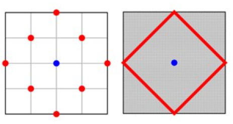 격자 좌표계에서 파란 점이 중심이라 할때, 중심을 기준으로 거리가 2인 지점을 빨간 점으로 표시하면 왼쪽 그림과 같다.