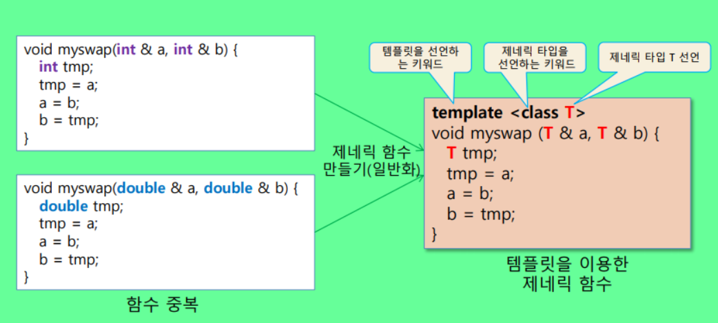 이와 같은 방법으로 중복된 함수들을 템플릿 함수로 바꾸는 과정을 일반화라고 한다. 이렇게 된 함수의 타입을 제네릭이라고 정의한다.