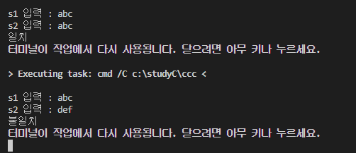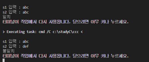 if(strcmp(문자열1, 문자열2) == 0)과 같은 방법을 사용해야 한다.