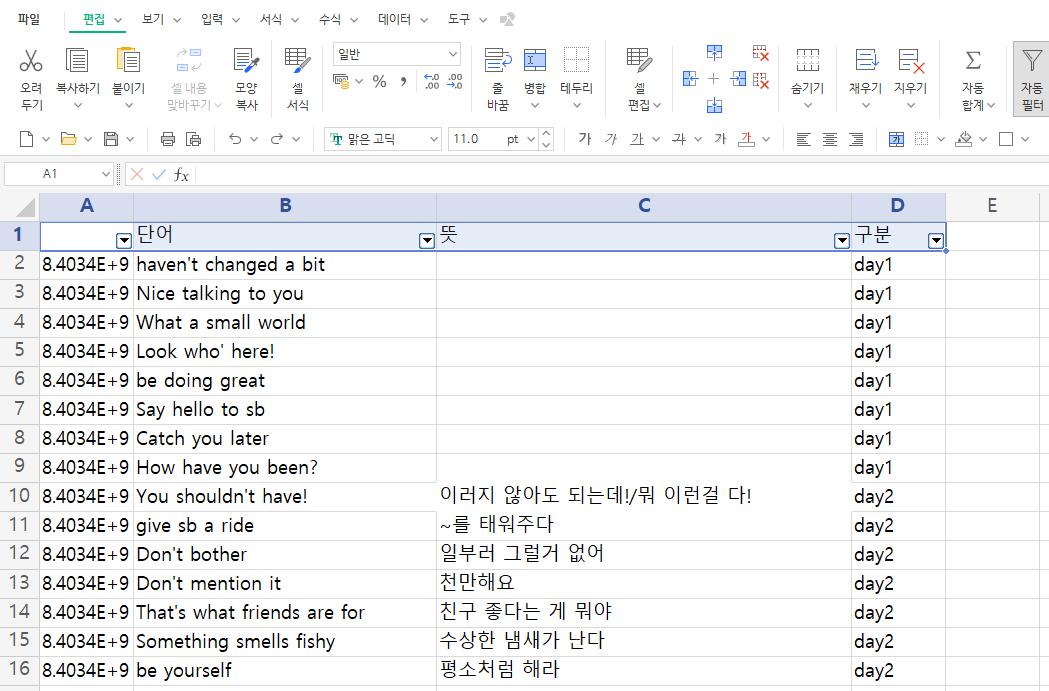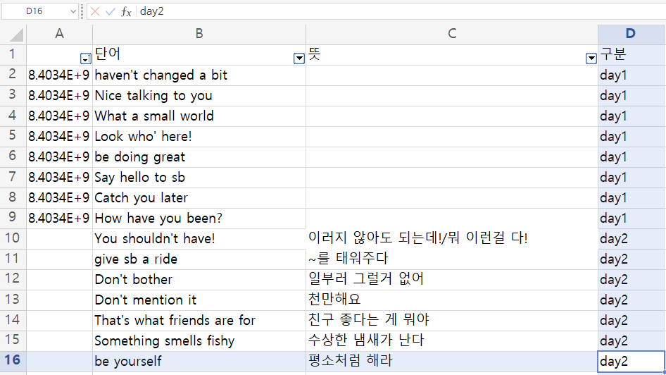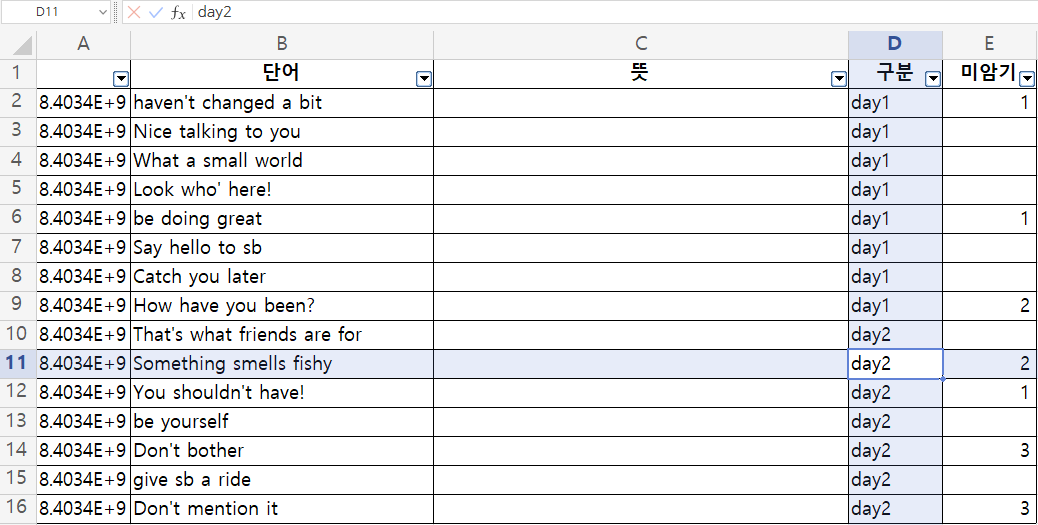 이런식으로 day2 항목만 따로 불러와서 A행 필터를 오름/내림차순 정렬 시키는 방법으로 랜덤 단어장을 활용할 수 있다.