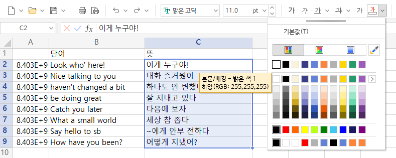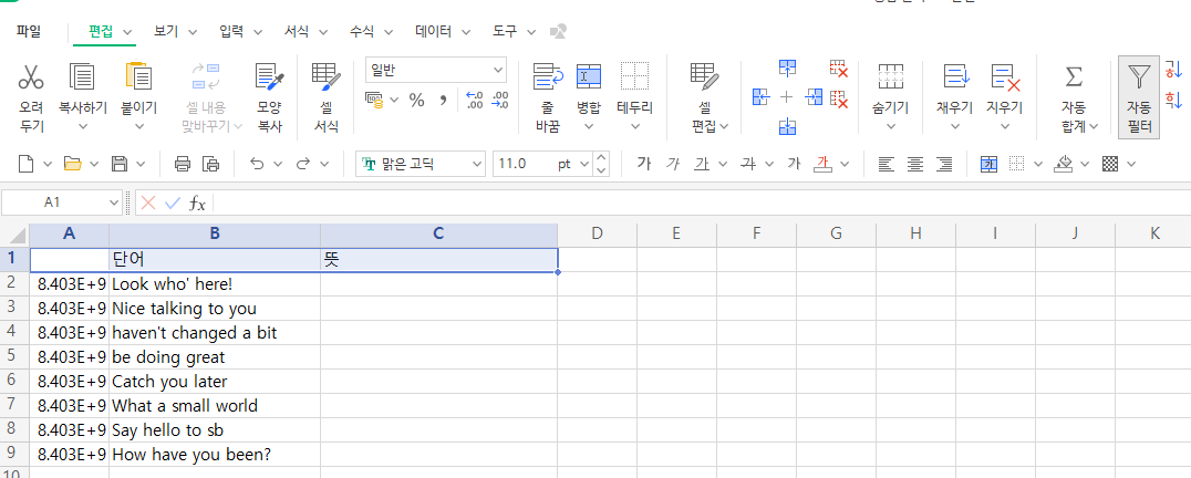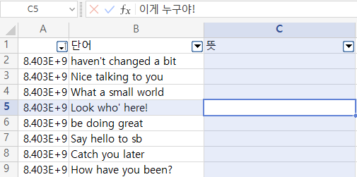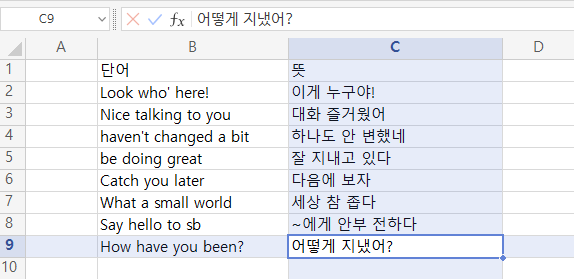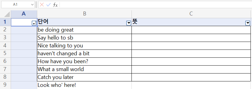 단어만 보고 뜻을 암기하고 싶을때 유용하다. 뜻이 기억나지 않을때 해당 셀을 클릭하면 위쪽에 뜻이 보이는 것을 확인할 수 있다.