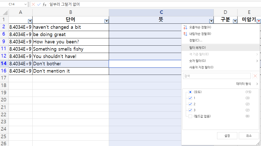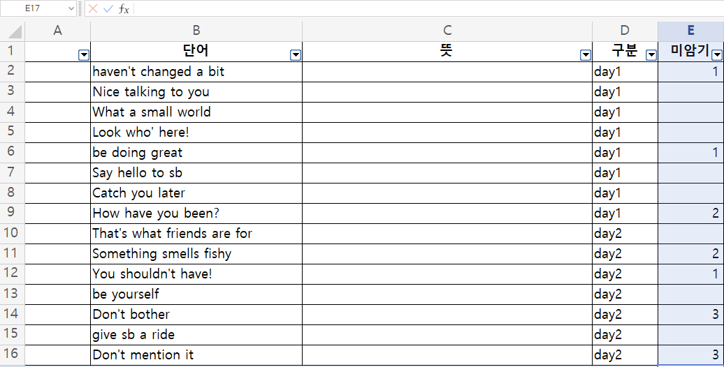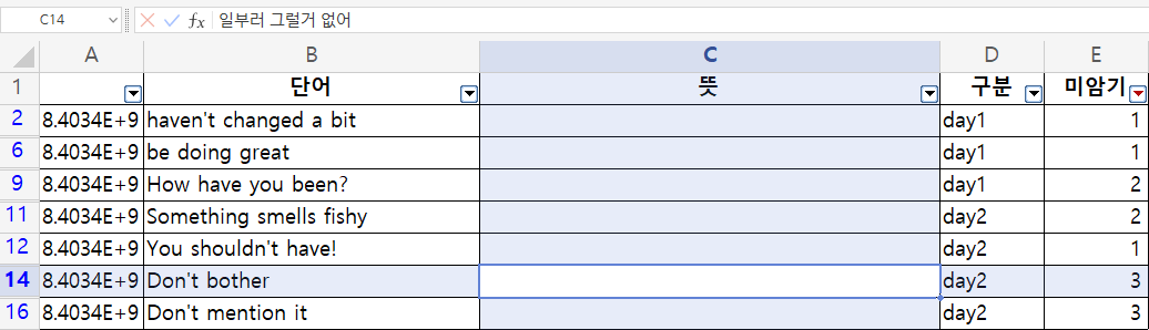 이 방법을 이용하면 잘 외워지지 않는 단어들만 추려내 다시 복습하는 방법으로도 응용할 수 있을 것이다. 암기가 잘 되지 않는 단어에 대해서 미암기 열의 값을 1씩 추가하는 방식으로 공부한다고 가정하자.