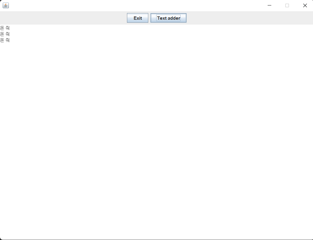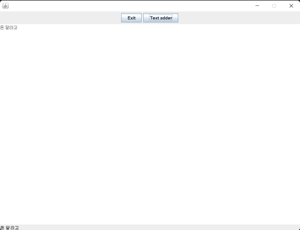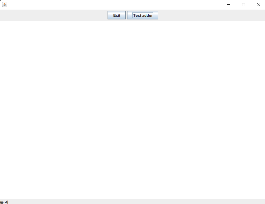 Exit버튼을 누르면 프로그램이 종료되고, Text adder를 누르면 텍스트 에어리어에 지정했던 글자가 출력된다.
