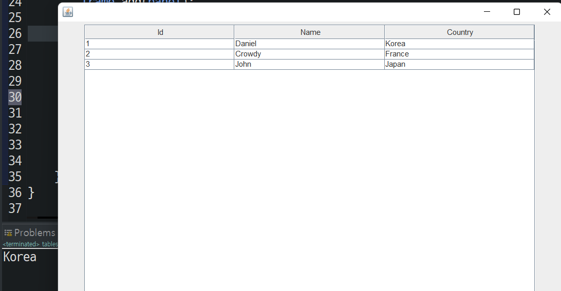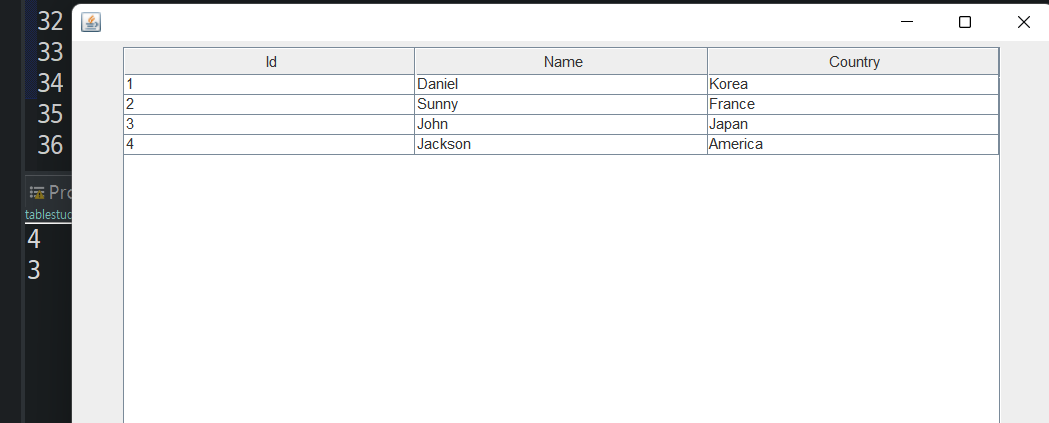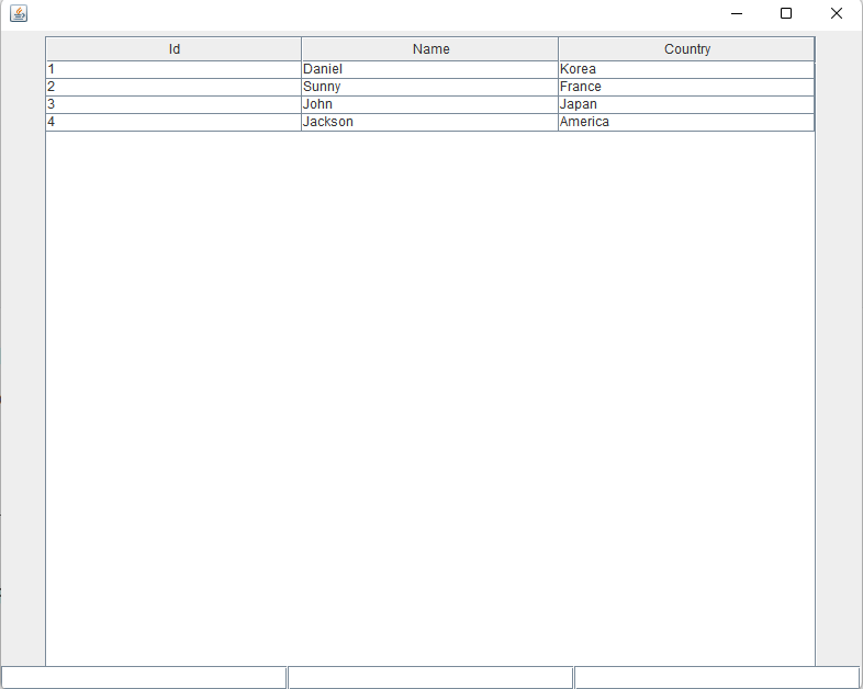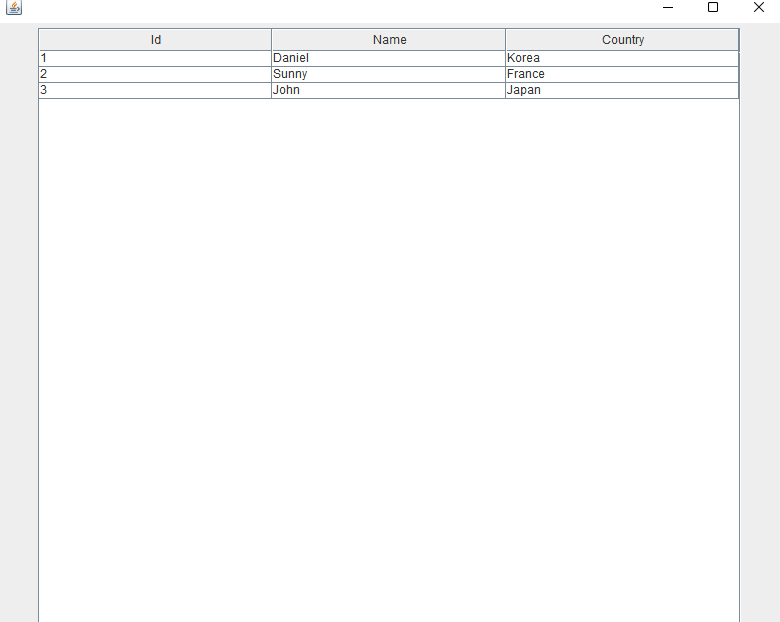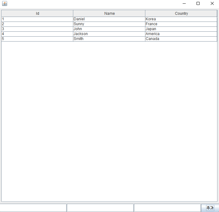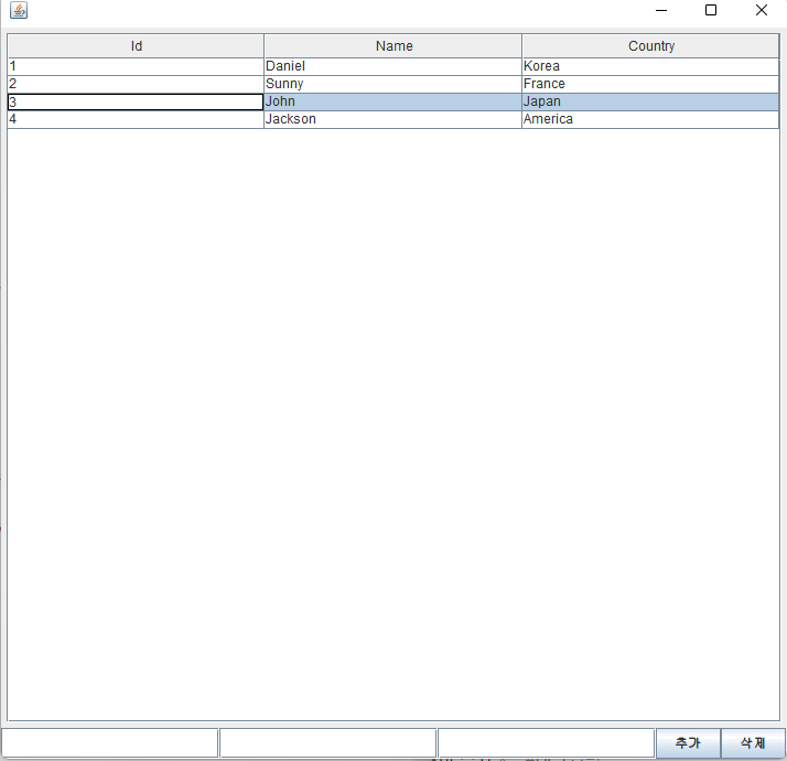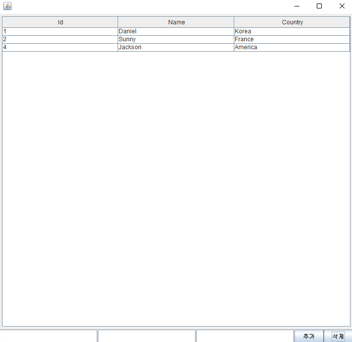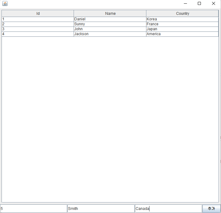 각각의 JTextField는 표에 삽입될 id, name, country열에 해당된다.