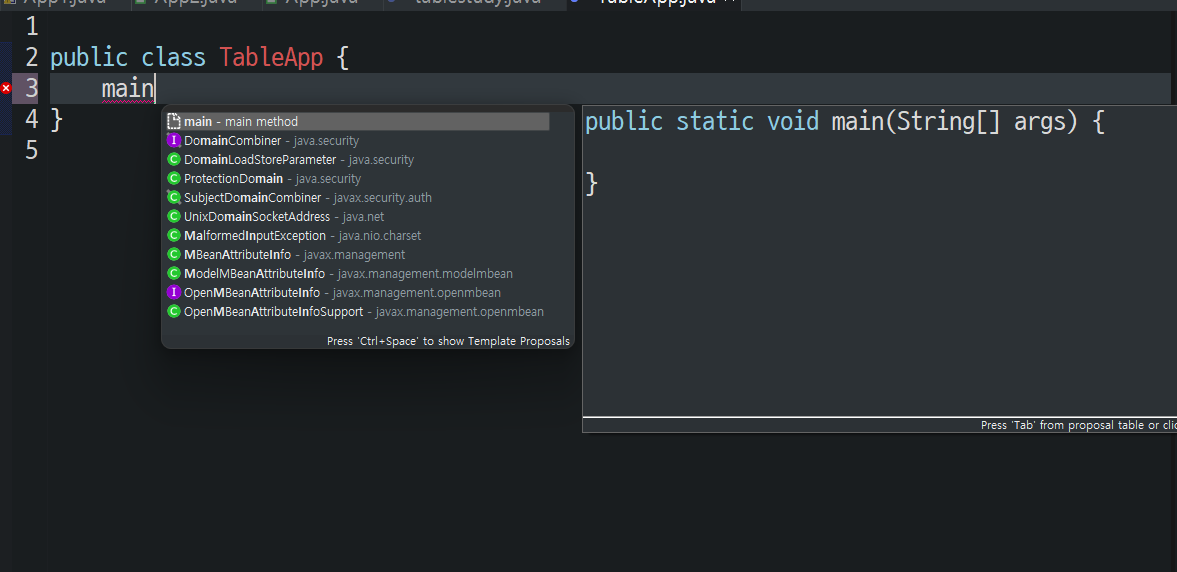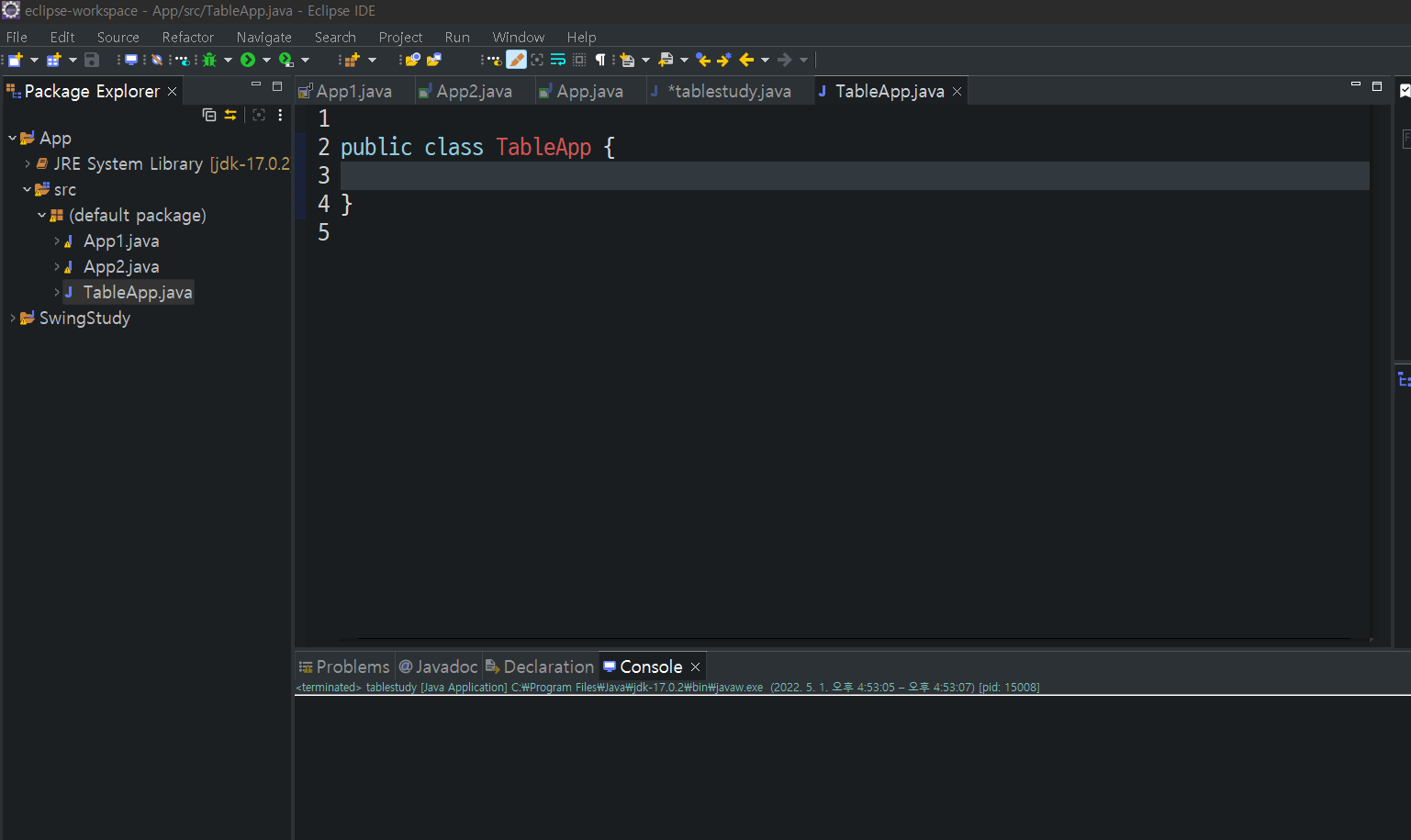 TableApp이라는 이름으로 클래스 하나를 만들었다.