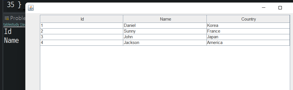 각각의 JTextField는 표에 삽입될 id, name, country열에 해당된다.