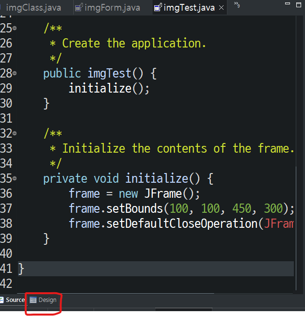 자동으로 화면에 창을 띄우는 기본 코드가 입력되어 있다. Design버튼을 눌러 윈도우 빌더창으로 이동한다.