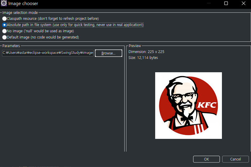 btn.setIcon(new ImageIcon("C:\\Users\\astar\\eclipse-workspace\\SwingStudy\\images\\KFC.jpg"));
