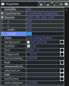 변수명을 btn으로 설정하고 Bounds값에서 가로, 세로 크기를 225x225로 맞췄다.