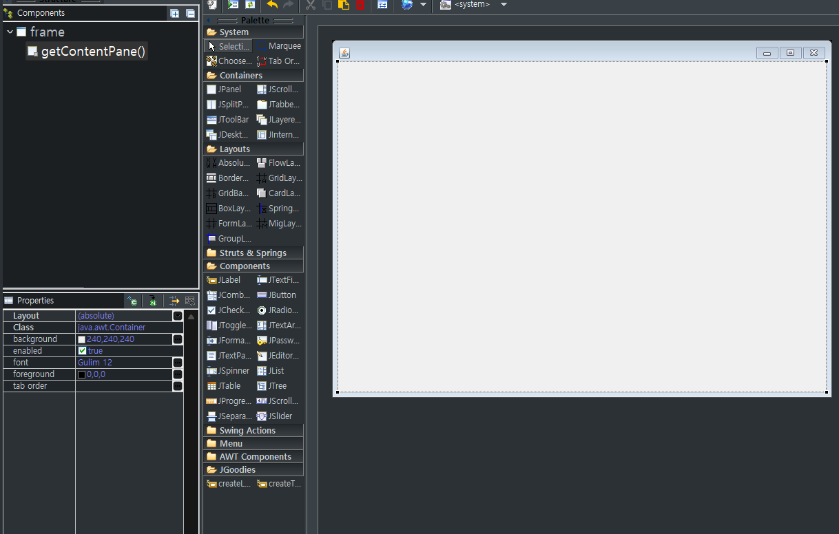 getContentPane() 패널에 Absolute layout을 적용하고 버튼을 225x225크기로 설정하겠다.