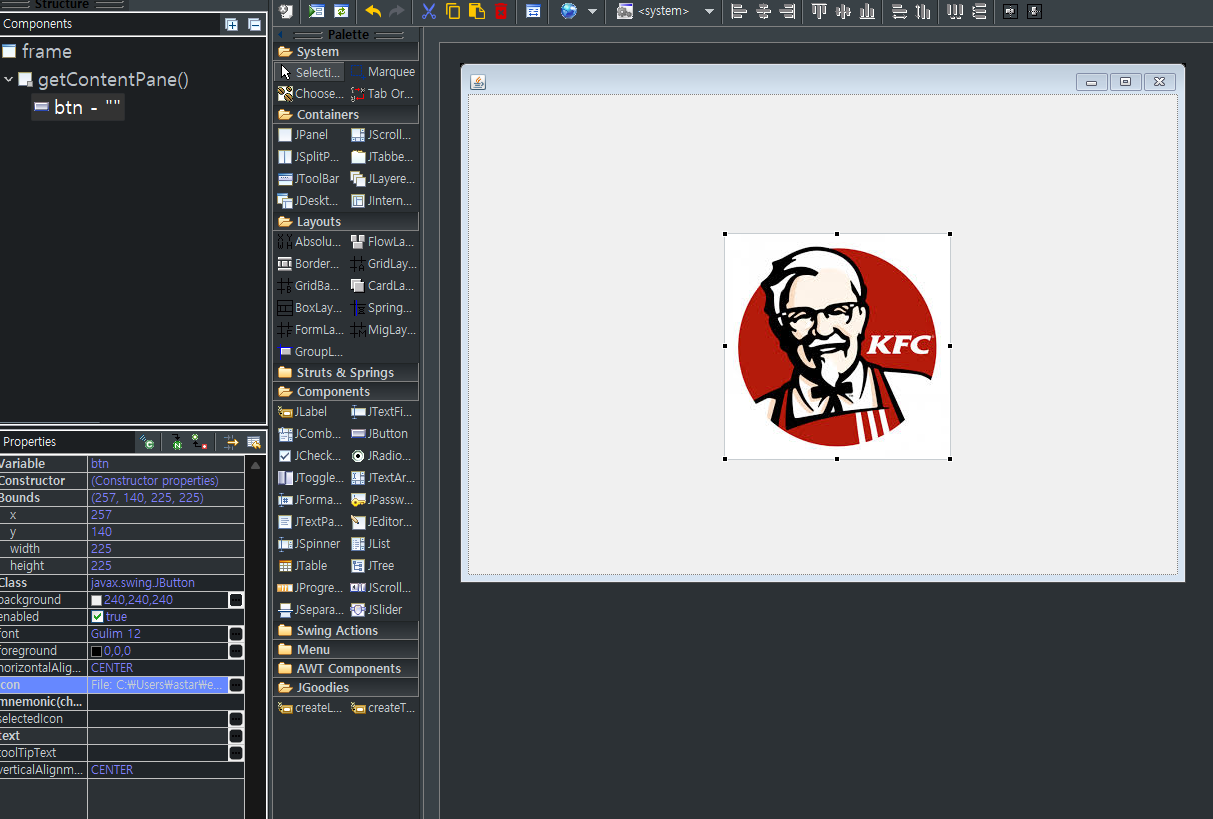 btn.setIcon(new ImageIcon("C:\\Users\\astar\\eclipse-workspace\\SwingStudy\\images\\KFC.jpg"));
