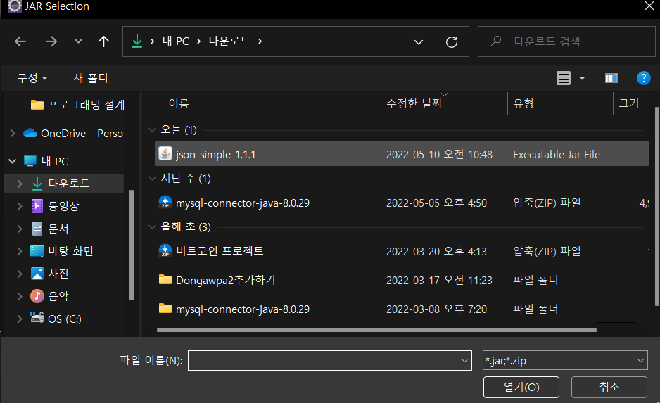 아까 다운받은 jar파일을 선택하고 열기를 클릭. 그리고 Apply and close를 누르면 프로젝트에 라이브러리가 적용된다.