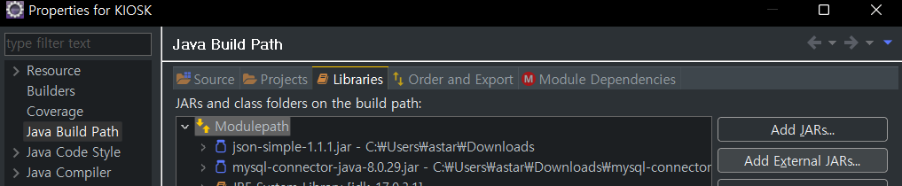 Modulepath를 클릭하고 오른쪽에 있는 Add External JARs...를 클릭한다.