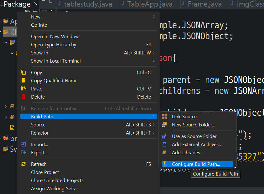 라이브러리를 적용할 프로젝트를 오른쪽 마우스 클릭 - Build Path - Configure Build Path...로 들어간다.