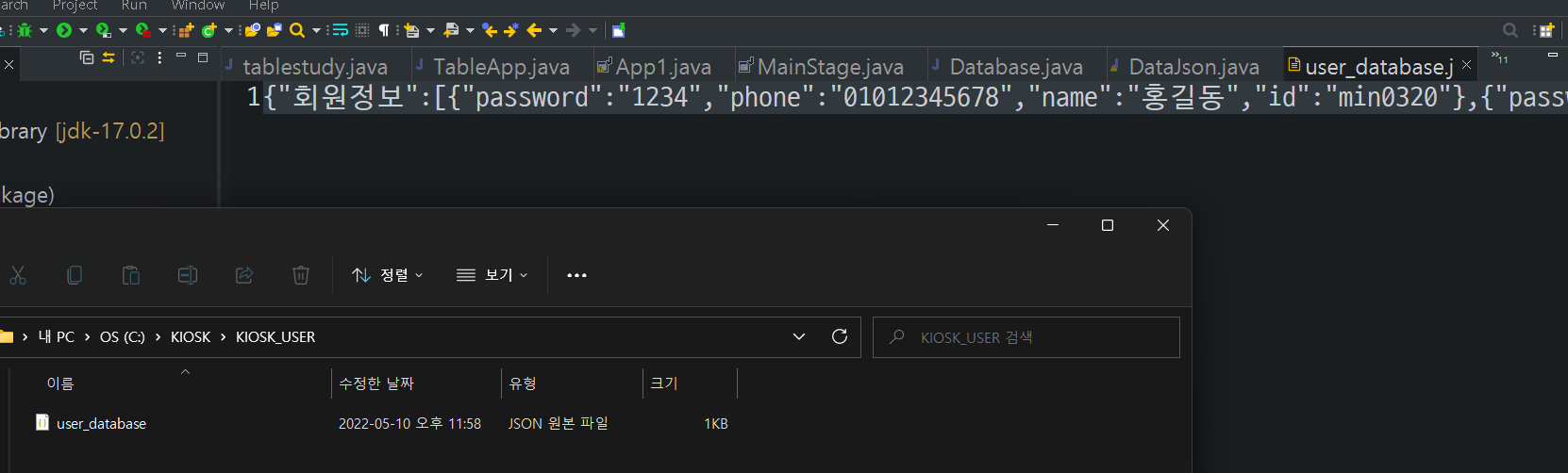 {"회원정보":[{"password":"1234","phone":"01012345678","name":"홍길동","id":"min0320"},{"password":"1234","phone":"01023456789","name":"장길산","id":"hun5327"}],"음식정보":[{"price":"3000","name":"떡볶이"},{"price":"3000","name":"떡볶이"}]}