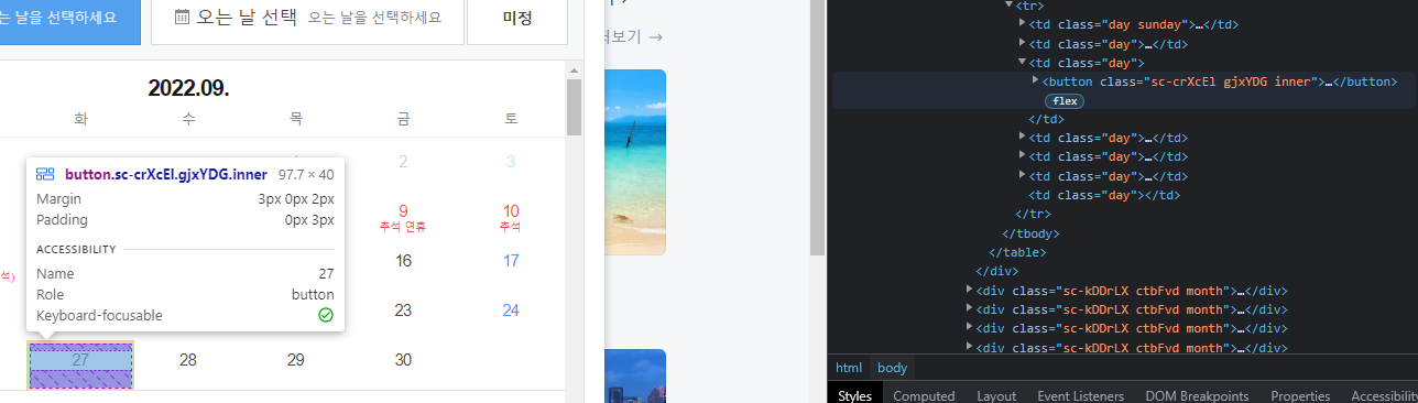 따라서 다음과 같이 코드를 작성하면 22년 9월 27일을 가는 날로, 22년 10월 28일을 오는 날로 선택할 수 있다.