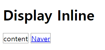 - inline : 콘텐츠만큼 영역을 차지. 줄 바꿈 X. width, height지정 X
