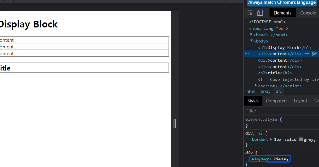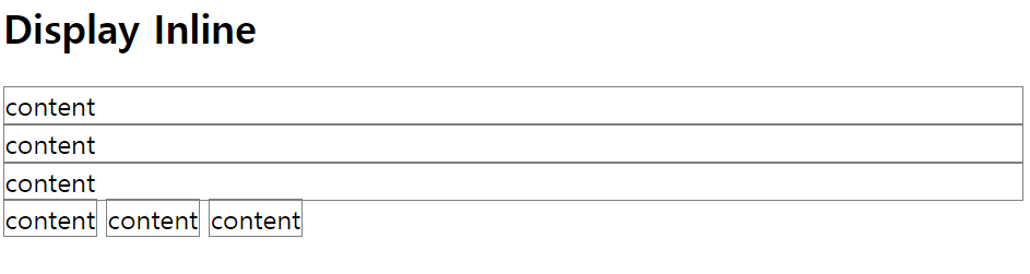 기본적으로 display: block이기 때문에 content가 가로로 꽉 차며 세로로 배치된 것을 확인할 수 있다.