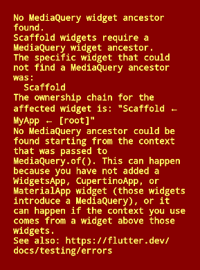 기본으로 내장되어있는 MaterialApp 위젯을 누락시키면 해당 에러가 발생한다.