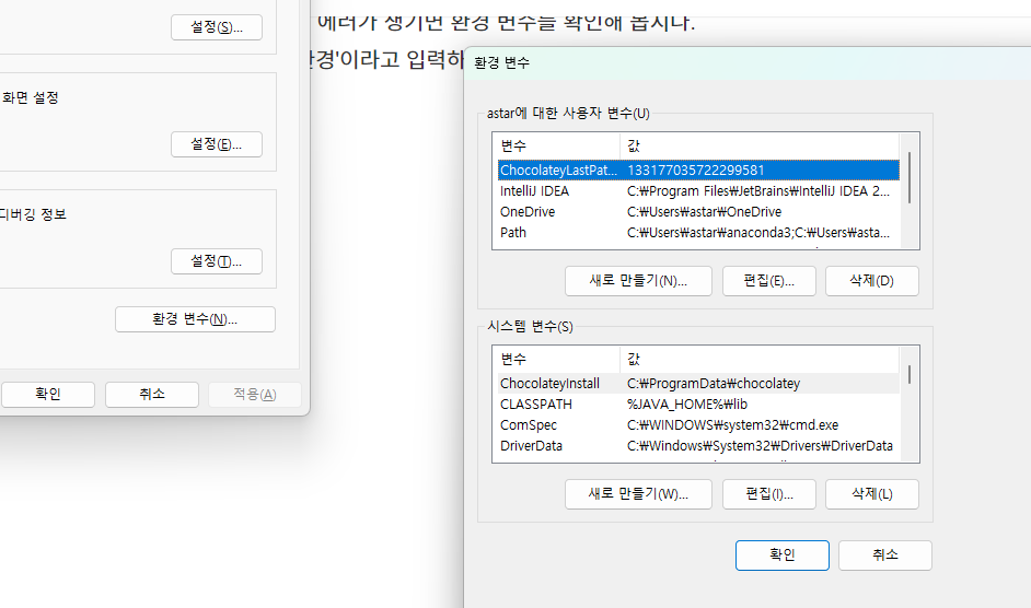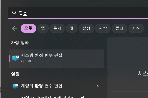 윈도우에 '환경'이라고 입력하면 '시스템 환경 변수 편집'이 나타납니다.