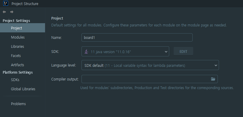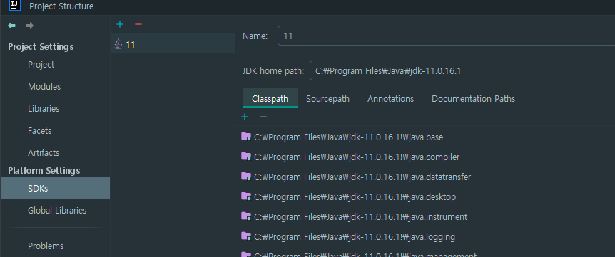 여기서 지정된 자바 버전과 스프링 부트 환경설정시에 맞추었던 자바 버전이 맞지 않을 때도 있습니다. 같도록 맞춰 줍니다.