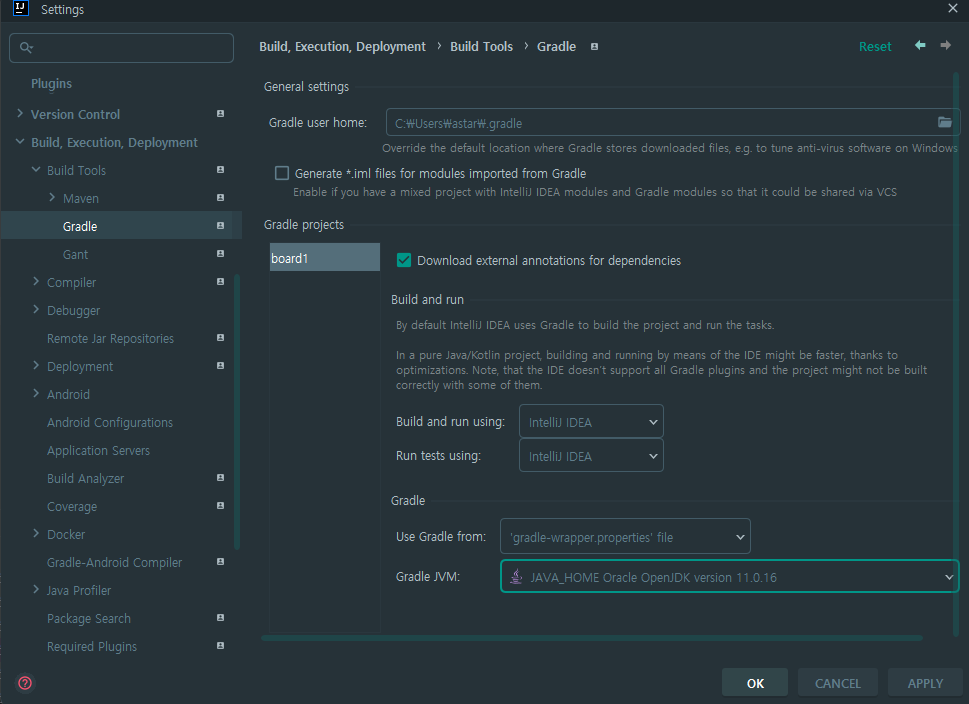 Gradle로 프로젝트를 실행하는 것보다 인텔리제이 IDEA로 실행하는 것이 더 빠르기 때문에 아래 세팅으로 맞춰줍니다. 여기서 Gradle JVM의 자바 버전을 11로 맞춰 주었습니다.