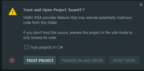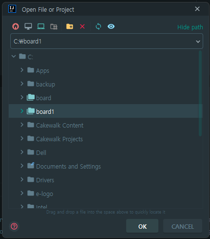 인텔리제이를 실행하고 C드라이브에 저장했던 폴더를 Open합니다.