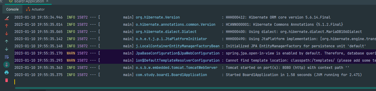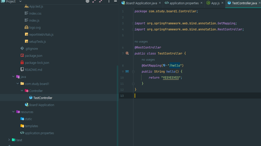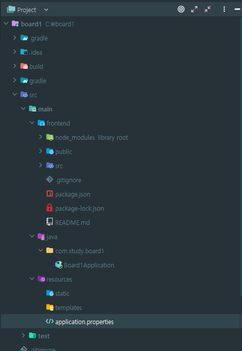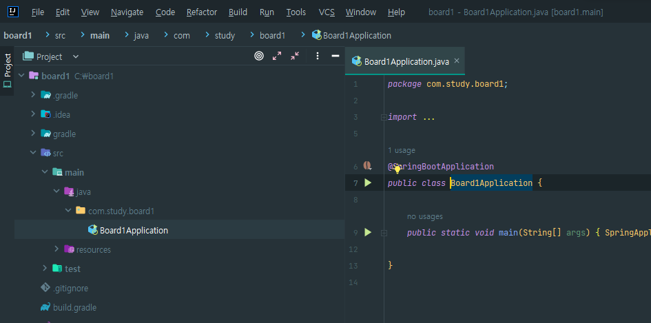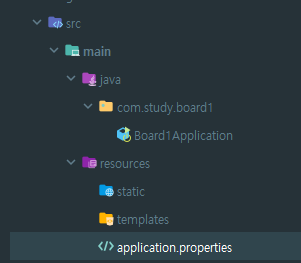 src/main/java/com.study.board1(설정했던 패키지 이름)/내부에 있는 자바 파일을 열어봅시다.