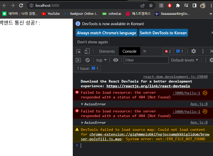 통신 실패했습니다. YESYESYES가 나타나야하는데 f12를 눌러 개발자 도구를 열어보니 AxiosError가 발생했음을 확인할 수 있었습니다.