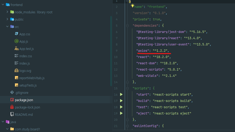 리액트가 설치된 frontend폴더에 axios를 설치해야합니다. 엉뚱한 경로에 설치하면 axios import문제가 발생할 수 있습니다.