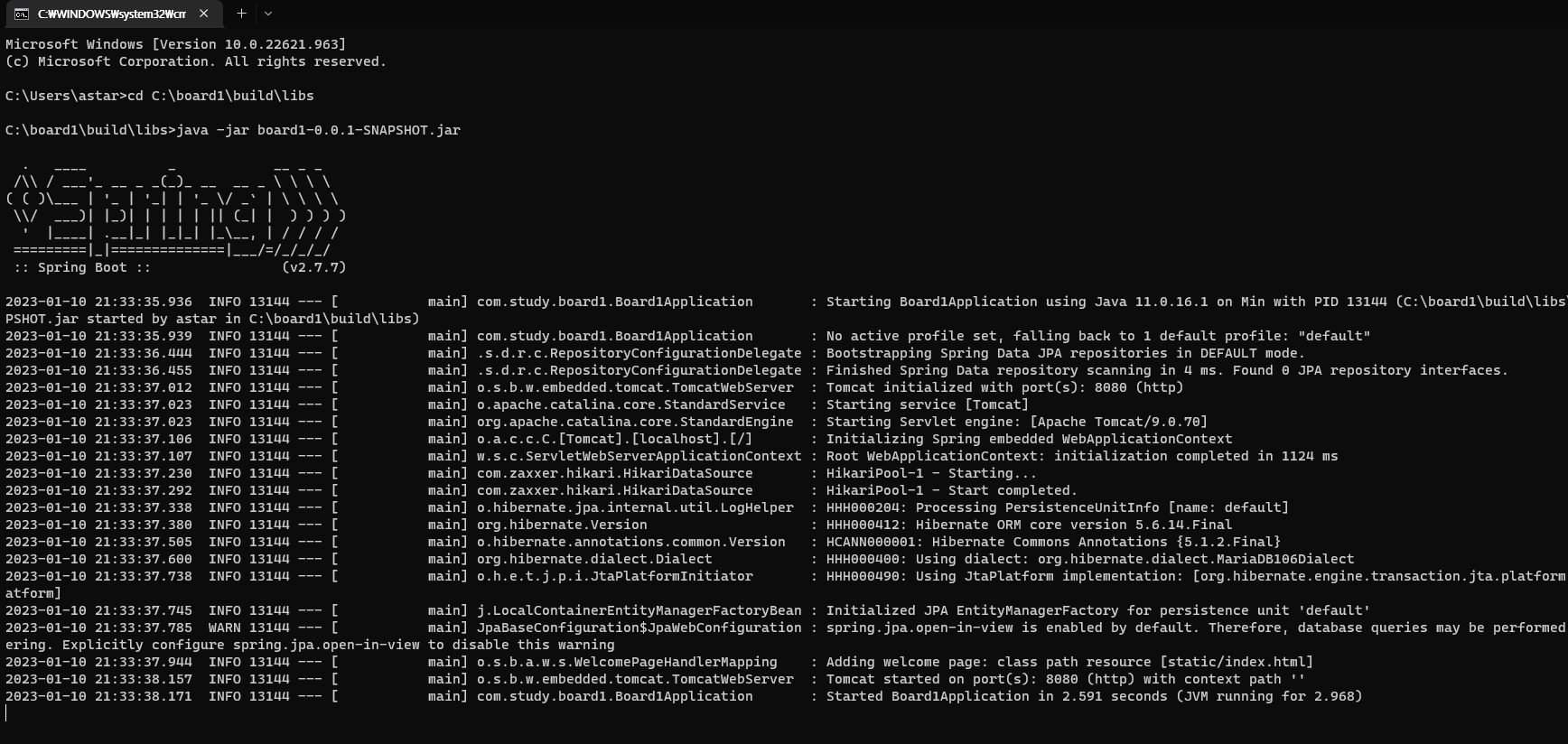 프로젝트가 있는 경로로 이동하고 java -jar [jar 파일명.jar]로 서버를 실행합니다.