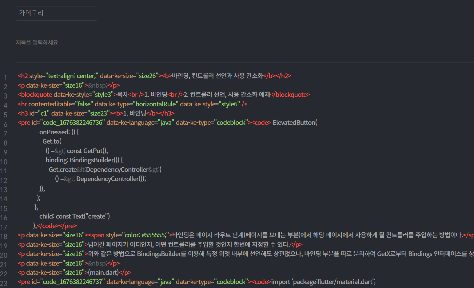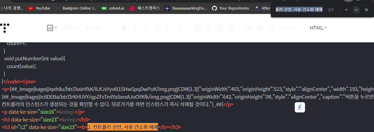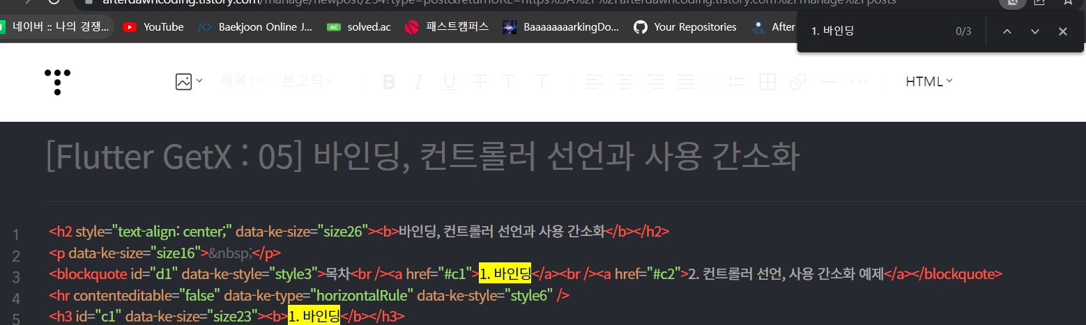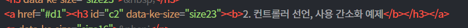 저같은 경우에는 바인딩, 컨트롤러 선언과 사용 간소화 저 부분을 [제목1](h2)로, 1. 바인딩, 2. 컨트롤러 선언 ~ 이 부분은 [제목2](h3)로 지정해두었습니다.