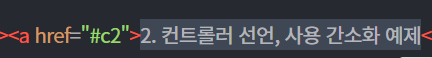 추가로, 해당 챕터의 텍스트를 클릭하면 다시 목차로 되돌아가도록 만들 수도 있습니다.(2. 컨트롤러 선언~ 여기를 누르면 목차가 있는 화면으로 이동합니다.)