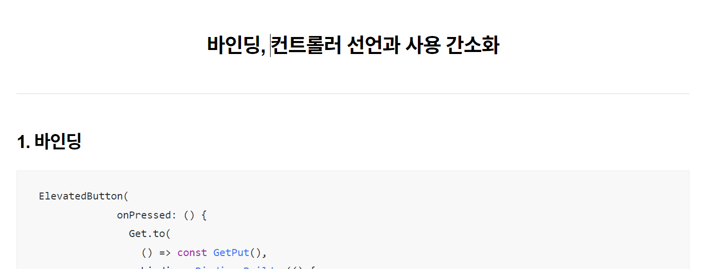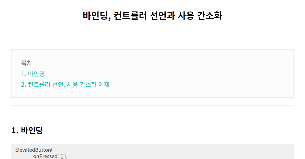 1. 바인딩 챕터를 누르면 바인딩이 표시된 화면으로 가고, 2. 컨트롤러~ 챕터를 누르면 2. 컨트롤러 ~가 있는 화면으로 이동할 겁니다.