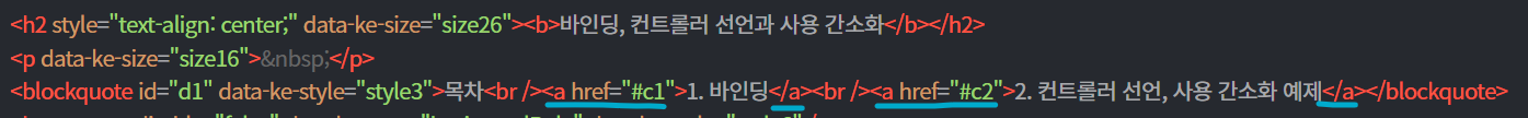 저같은 경우에는 바인딩, 컨트롤러 선언과 사용 간소화 저 부분을 [제목1](h2)로, 1. 바인딩, 2. 컨트롤러 선언 ~ 이 부분은 [제목2](h3)로 지정해두었습니다.