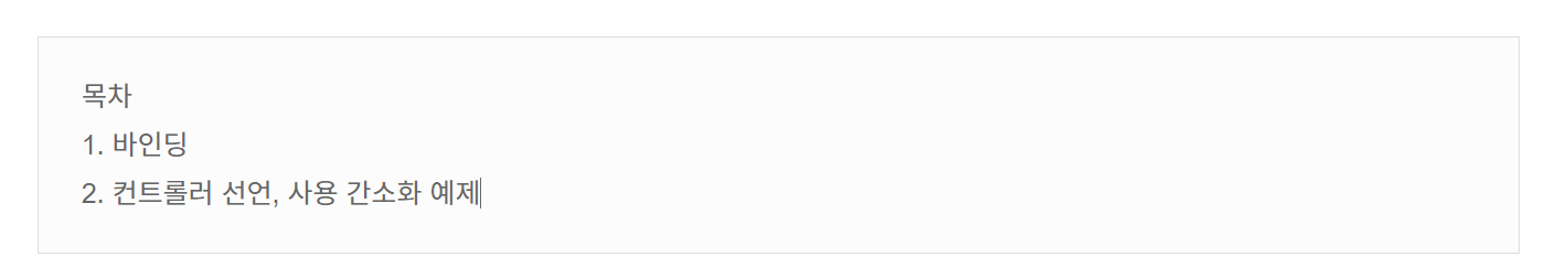 1. 바인딩 챕터를 누르면 바인딩이 표시된 화면으로 가고, 2. 컨트롤러~ 챕터를 누르면 2. 컨트롤러 ~가 있는 화면으로 이동할 겁니다.