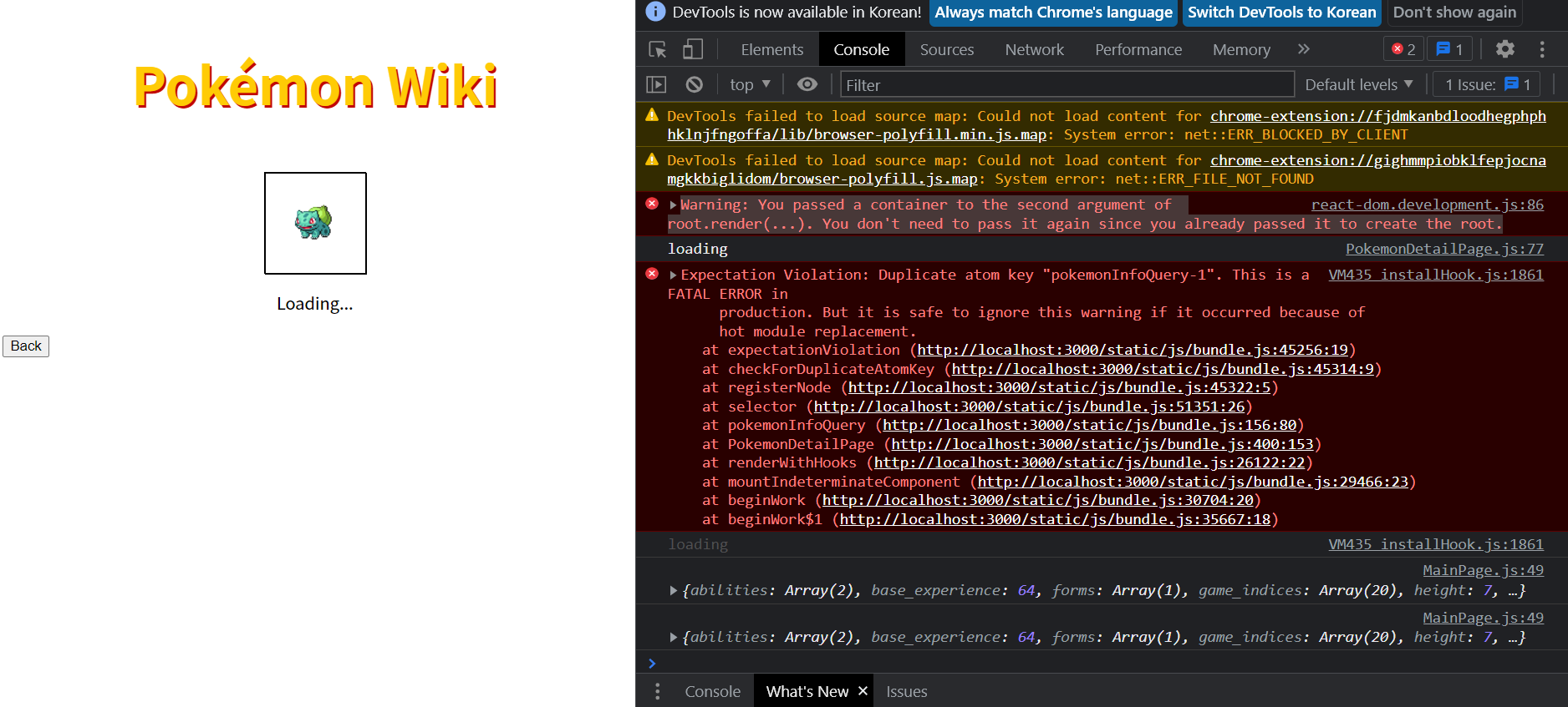 포켓몬 이미지의 경우, useRecoilLoadable의 state값과 상관없이 url로 부터 이미지를 가져오기 때문에 이상이 없었으나, state값이 계속 loading상태에 머물러 있기 때문에 데이터를 정상적으로 가져왔음에도 불구하고 렌더링이 되지 않는 것이었다.