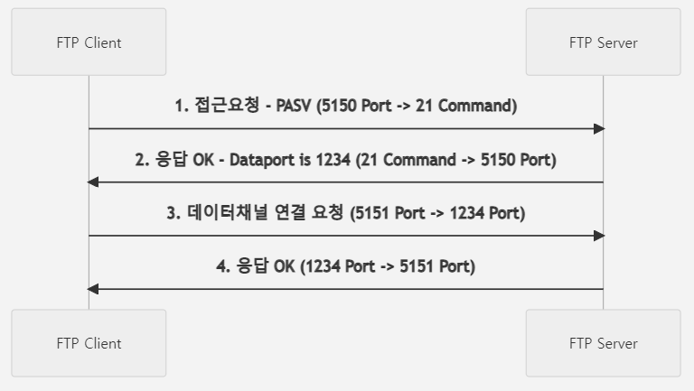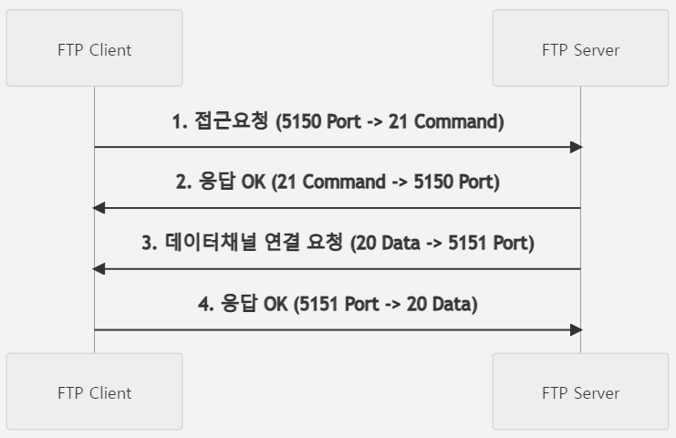 1. 클라이언트는 서버의 21번 포트로 접속한 후 자신이 사용할 두 번째 포트를 서버에 미리 알려준다.