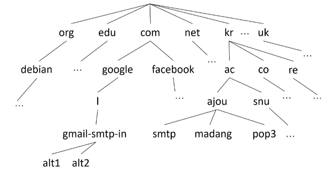 최상위에 있는 Root Domain로부터 하위 노드로 연속적으로 이어진 계층구조이다.