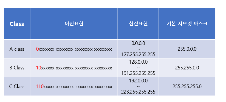 | A 클래스 | 대규모 네트워크 주소 | D 클래스 | 멀티캐스트(multicast) 주소 |