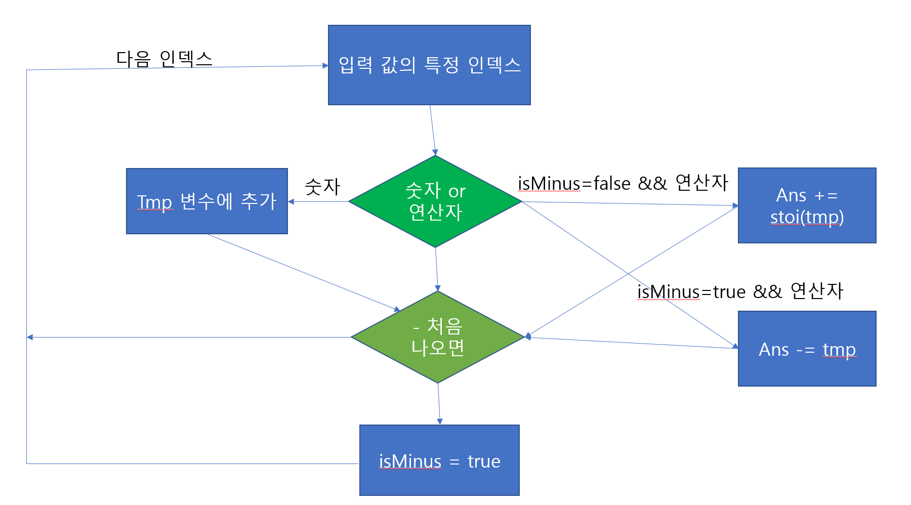 정답으로 출력할 변수 int ans = 0에 tmp에서 가져온 정수를 더하거나 빼주어야 한다. ( ans += stoi(tmp) or ans -= stoi(tmp) )