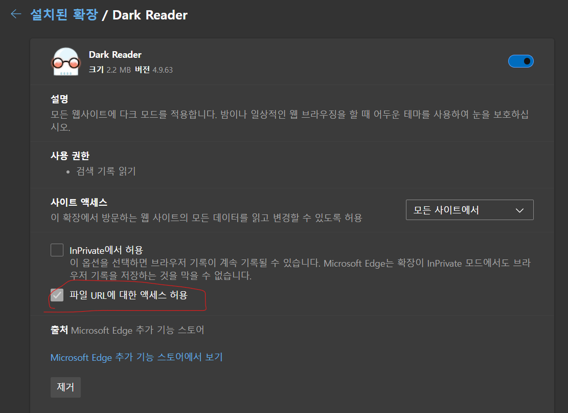 확장 프로그램이 설치되었더라도, 외부 url에 대한 접근을 허용하지 않으면 다크모드가 적용되지 않습니다.