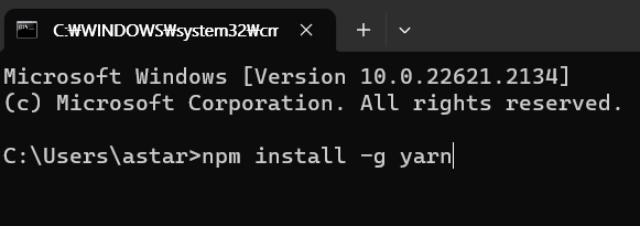 yarn 패키지가 없는 경우 명령프롬프트에서 아래 명령어로 설치를 해줍니다.