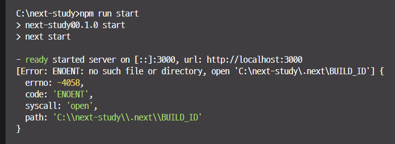 [Error: ENOENT: no such file or directory, open 'C:\next-study\.next\BUILD_ID'] { errno: -4058, code: 'ENOENT', syscall: 'open', path: 'C:\\next-study\\.next\\BUILD_ID' }