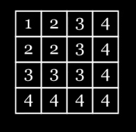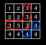 빨간색 구간은 행과 열이 3으로 같은 구간이다. 파란색 구간의 경우 행 또는 열 한쪽이 더 큰 값을 가지므로 더 큰 값으로 할당되었다.