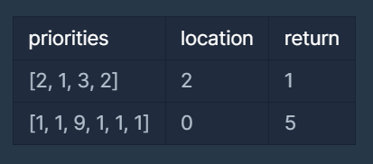 큐에는 priorities 원본 배열 값을 전부 집어 넣고, 내림차순된 배열의 값과 큐의 특정 값이 일치하는 경우 answer를 하나씩 올리고,