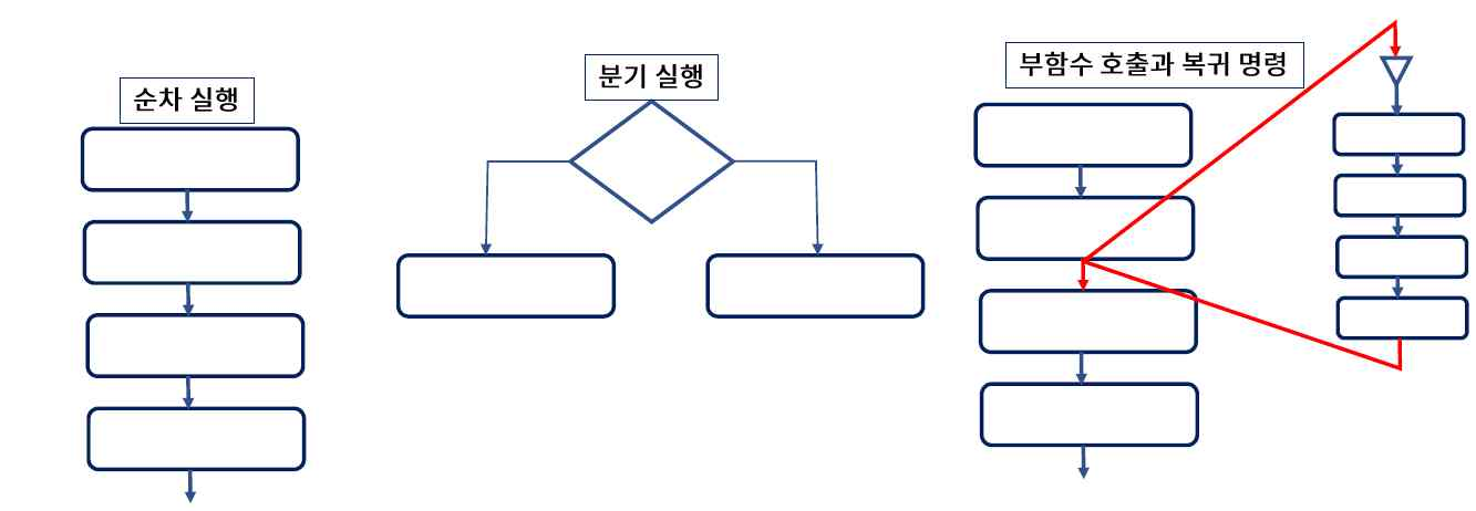 순차적 실행 명령어, 분기 명령어, 부 함수 호출 명령어, 복귀 명령어