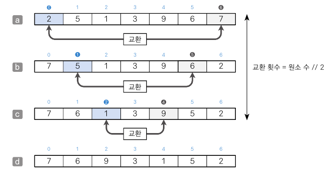 이와 같은 방법으로 원소를 재배열하면 교환 횟수는 원소 수에 2를 나눈 몫과 같다는 것을 알 수 있다.